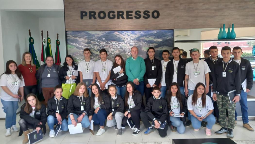 Esta semana o prefeito de Progresso Paulo Gilberto Schmitt e a secretária de Administração Rosileni Gilardi, receberam a visita de uma comitiva de alunos da escola municipal Luis Gonzaga, de Campo Branco, que participam do programa Crescer Legal, do Sinditabaco. O objetivo foi conhecer a organização politica e administrativa da prefeitura, as funções e responsabilidades do prefeito, além da geração de impostos e aplicação em serviços públicos.