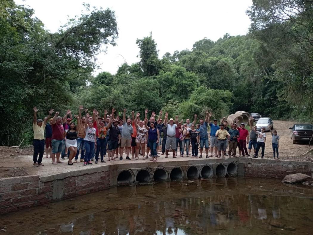 o último sábado, o prefeito Paulo Gilberto Schmitt, o vice Luiz Manini e o secretário de Obras e Viação, Alberto Brancher, participaram de um ato festivo, organizado pelos moradores, para a inauguração da Estiva sobre o Arroio Bate e Vira, que liga as localidades de Bate e Vira Alta e Baixa, próximo a divisa com Fontoura Xavier. Ocorre que, na grande cheia de 2010 a ponte feita com tubos que existia no local foi arrancada pela força das águas e desde então, os usuários tinham que passar por dentro do arroio para fazer a travessia, que muitas vezes era inviabilizada em função das chuvas e elevação do nível da água. Brancher salientou que, para a nova estrutura, foram utilizados 32 canos de bueiro de 60 cm, deixando a travessia seca. Conforme Schmitt, além de trazer mais segurança, a obra traz mais agilidade aos usuários e possibilita a travessia praticamente o ano todo, mesmo durante o período das chuvas, o que foi endossado por Manini.