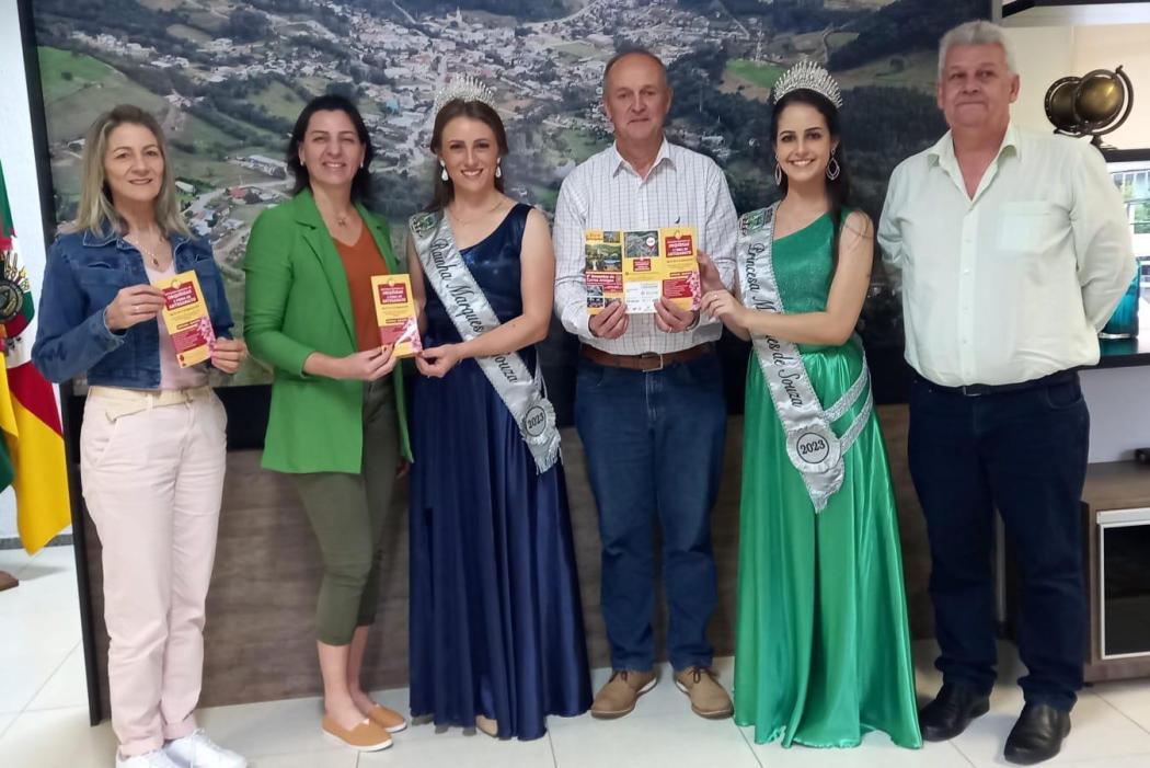 Na quinta-feira (17), o prefeito Paulo Gilberto Schmitt, a secretária de Administração Rosi Gilardi e a secretária de Educação Simone Berté, receberam uma comitiva de Marques de Souza. A visita foi das soberanas: rainha Kelly Rischter e a princesa Natália Bonassina, na companhia do secretário municipal da Administração Ricardo Kich. Na ocasião, entre outros, a comitiva entregou o convite para a 8ª Exposição Regional de Orquídeas e Feira de Artesanato. O evento irá transcorrer nos dias 25, 26 e 27 de agosto. Com entrada gratuita, o evento terá: exposição e feira de orquídeas; feira do artesanato; feira do turismo; pavilhão da agroindústria familiar; exposição de carros antigos; brinquedos infláveis gratuitos; praça de alimentação; feira municipal da saúde; e shows.Schmitt agradeceu o convite e aproveitou para convidar a comitiva para participar da IV Expofeira e o III Festival de Progresso com Humor, que ocorrem nos dias 30 de novembro, 1º, 02 e 03 de dezembro de 2023, no complexo do Grêmio Esportivo Gaúcho
