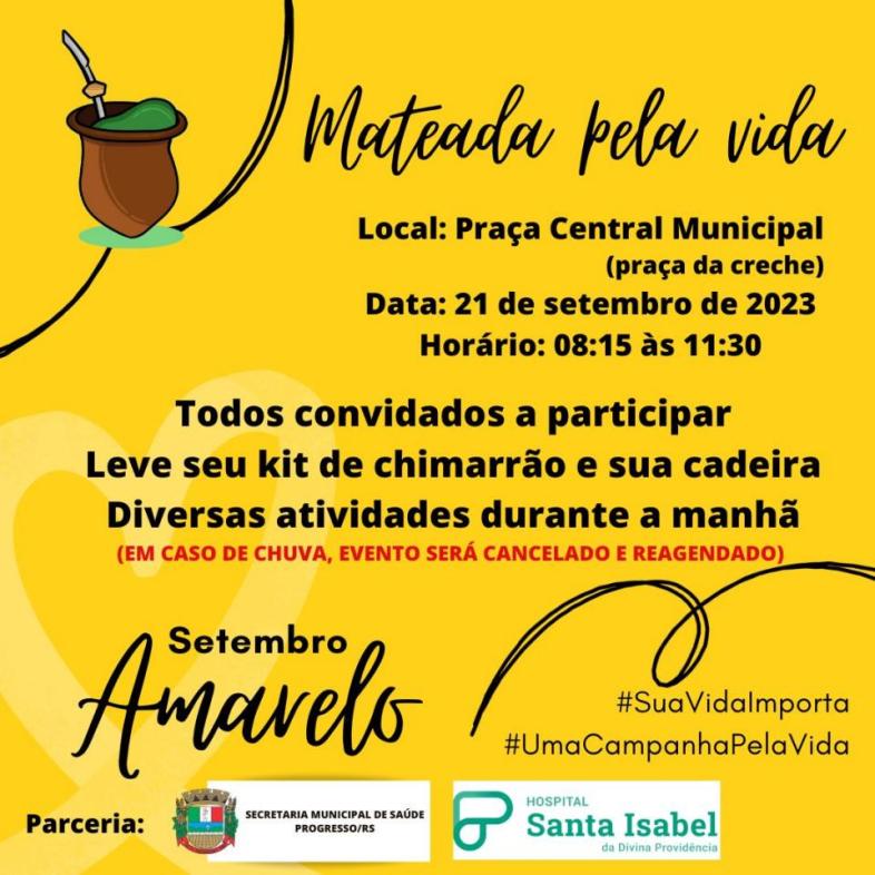 Dentro da programação do Setembro Amarelo, a Administração Municipal em parceria com o Hospital Santa Isabel realiza na quinta-feira (21) a Mateada pela Vida. Será das 8h15min às 11h30min na Praça Central, ao lado da creche. Todos estão convidados para levar o seu kit de chimarrão e cadeira. Haverá diversas atividades de integração. Em caso de chuva o evento será reagendado.