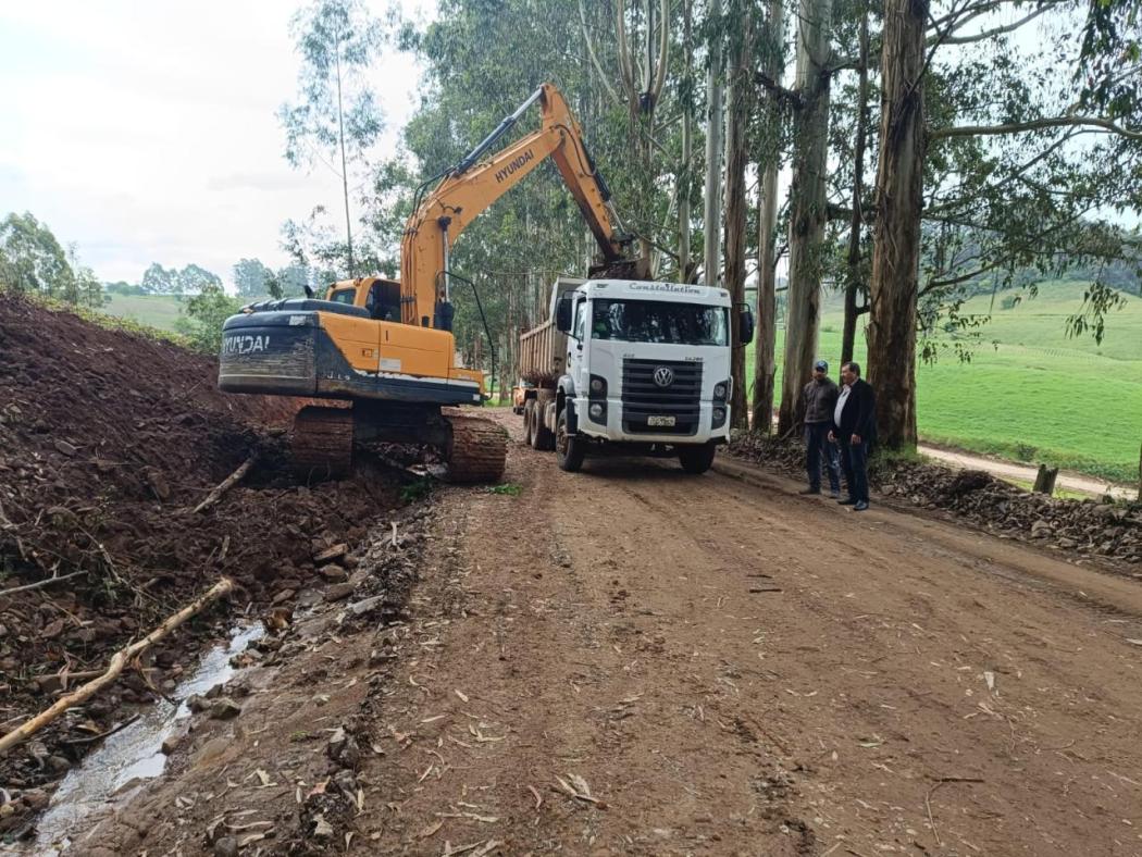 Hoje (18), o prefeito em Exercício Luiz Manini acompanhou a retomada dos serviços de alargamento e recuperação da estrada geral de acesso a Campo Branco, bastante prejudicada com as últimas enxurradas. A equipe da secretaria de Obras e Viação foi dividida em várias frentes, a fim de realizar os serviços mais urgentes como tapa buracos e borrachões em função do excesso de chuva. “Estamos dando prioridade onde os estragos estão prejudicando o trânsito e dificultando a passagem de pedestres e motoristas”, salientou o secretário Alberto Brancher. “Fomos severamente prejudicados pelas chuvas, inclusive as lavouras, que não estão se desenvolvendo. Também sabemos que muitos produtores estão precisando da recuperação dos acessos às propriedades, a fim de garantir o escoamento da produção e estamos trabalhando para que todos sejam atendidos, dentro da nossa capacidade de máquinas e pessoal” justificou Manini.