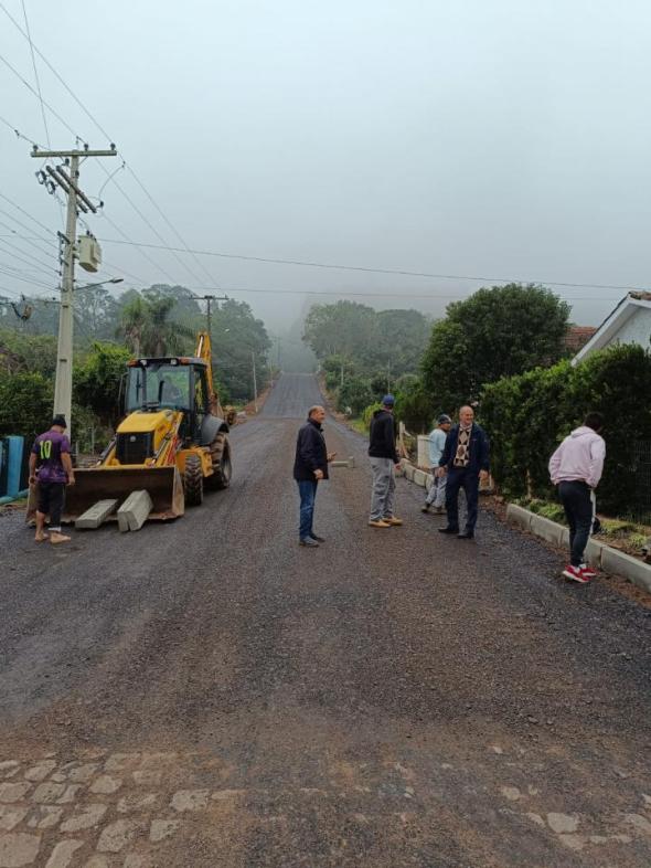 Semana passada a rua Quatro de novembro recebeu a imprimação do asfalto, faltando apenas a colocação dos cordões e capa asfáltica. Esta semana o prefeito Paulo Gilberto Schmitt, o secretário municipal de Obras, Viação e serviços públicos Alberto Brancher e o secretário da Agricultura, Ronaldo Paloschi, conferiram o andamento das obras. A referida rua foi alargada e teve mais um trecho aberto pela Secretaria de Obras, fazendo a ligação com a rua Antônio Iorra, além de nova canalização e drenagem, somando 180 metros lineares de pavimentação, sendo que a Administração Municipal ficou responsável pela preparação da base, reduzindo significativamente os custos da obra, cujo asfalto será fornecido pela Construtora Giovanella, vencedora da licitação. “Foi uma grande melhoria, pois antes os moradores do topo do morro precisavam fazer uma grande volta para chegar às suas casas, pois não havia ligação com a quatro de novembro”, salientou o prefeito.